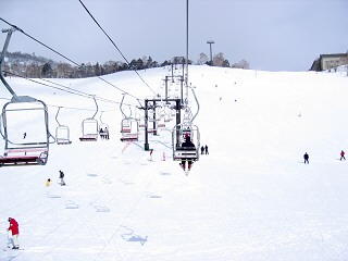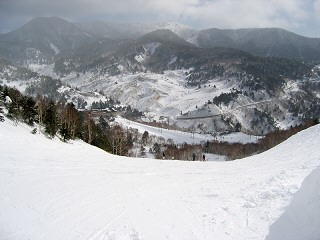 万座温泉スキー場の唯一の上級者コースである第四ゲレンデ上部からプリンスゲレンデを望む。