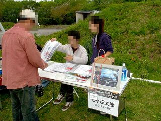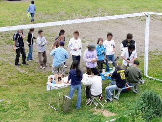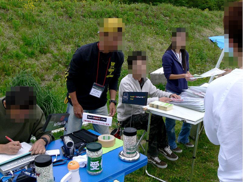 名札、サーフ用の氏名プレート、ステッカー、本日の案内、キャンプ場のパンフを配付&集金中。