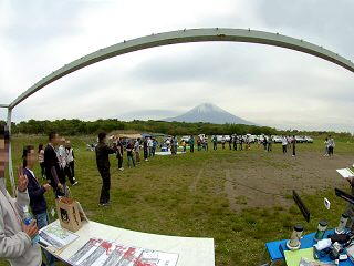 富士山をバックに、代表の挨拶、参加メンバーの自己紹介中の図です。