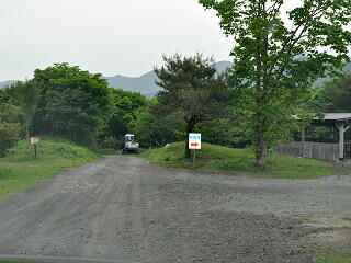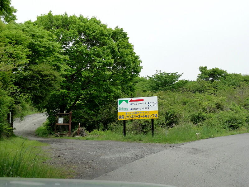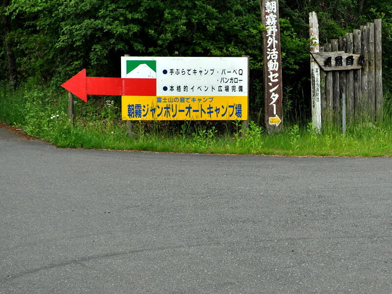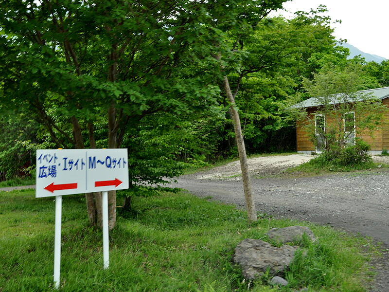 左側にあるキャンプ場受付棟を超えて行くとこの看板があるので、矢印の通りに左折します。