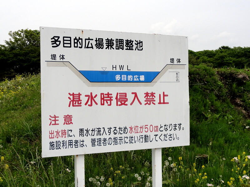 水場の反対側にこの看板があります。 ここがオフ会会場の多目的広場です。 大雨の時は池になるらしい...