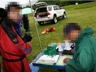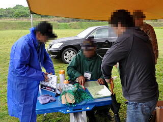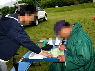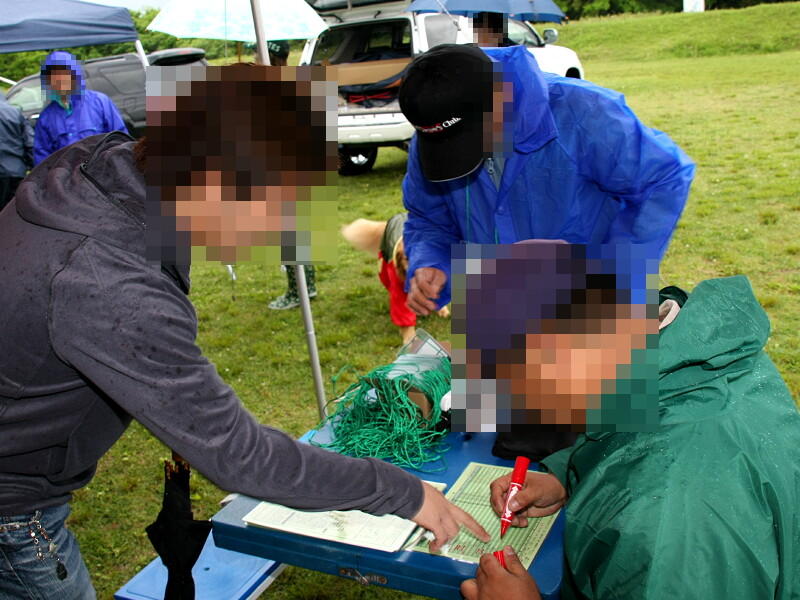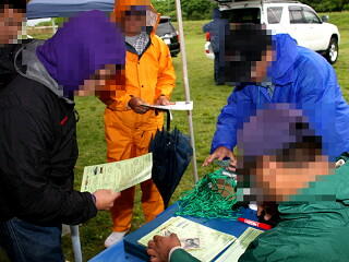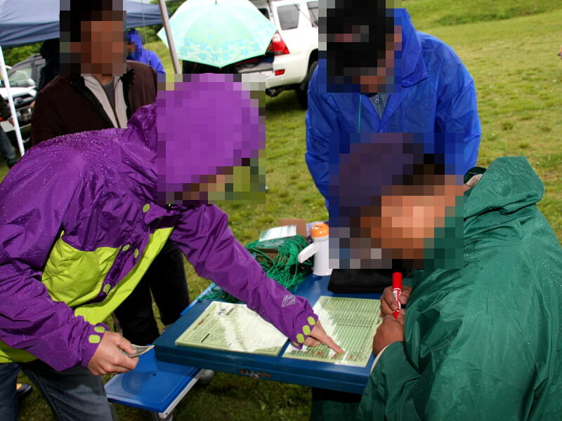 雨が降りしきる中での受付です。