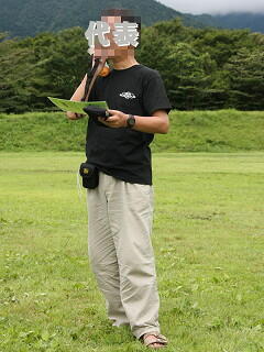 代表の挨拶の図。 靴は昨日の雨でビショビショになってしまったので、サンダルで失礼します。