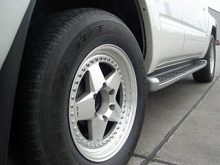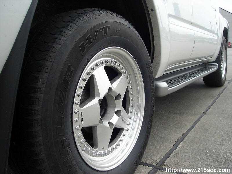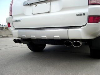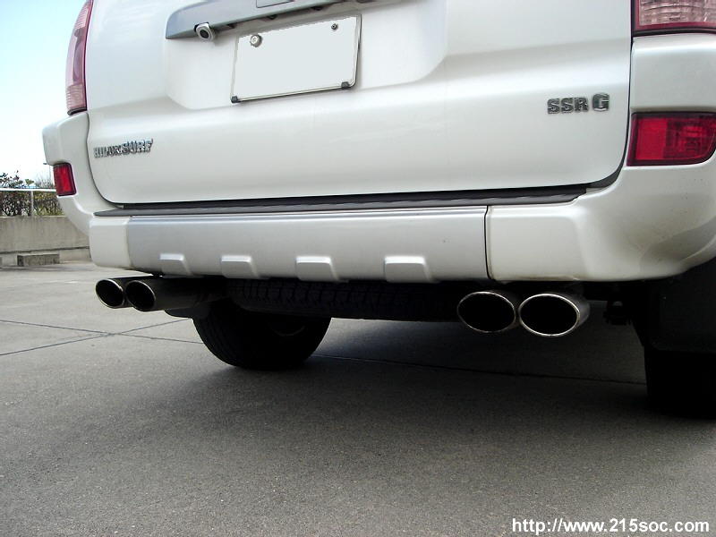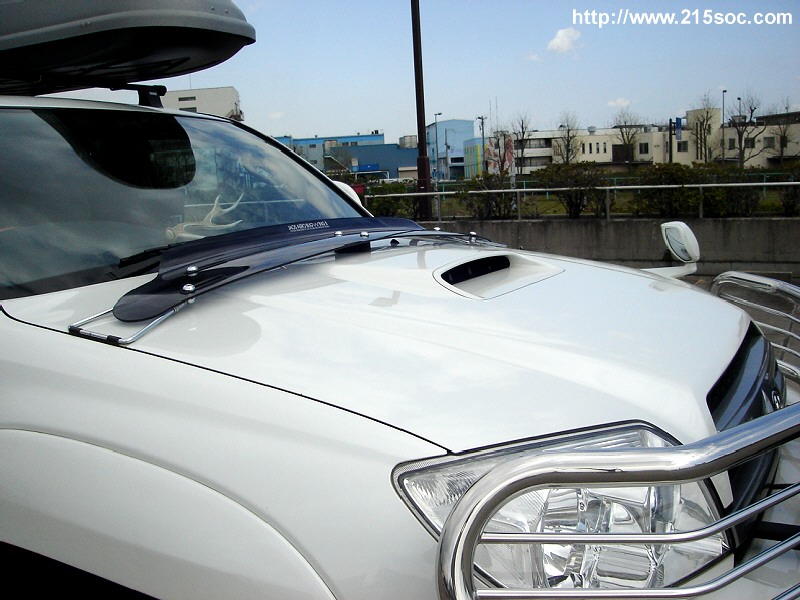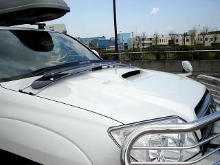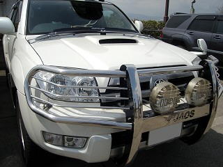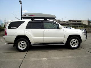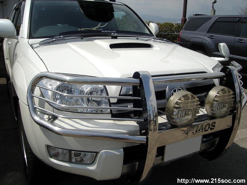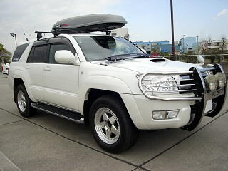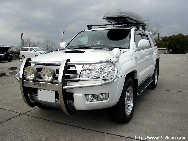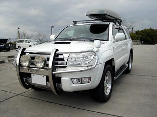 ボンネットのエアインテーク、ブルバー、ルーフボックス、4本出しマフラー装着が特徴のサーフです。